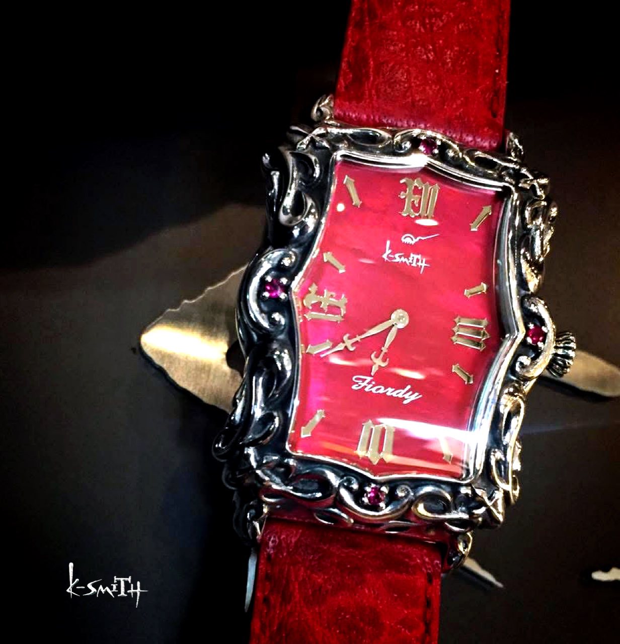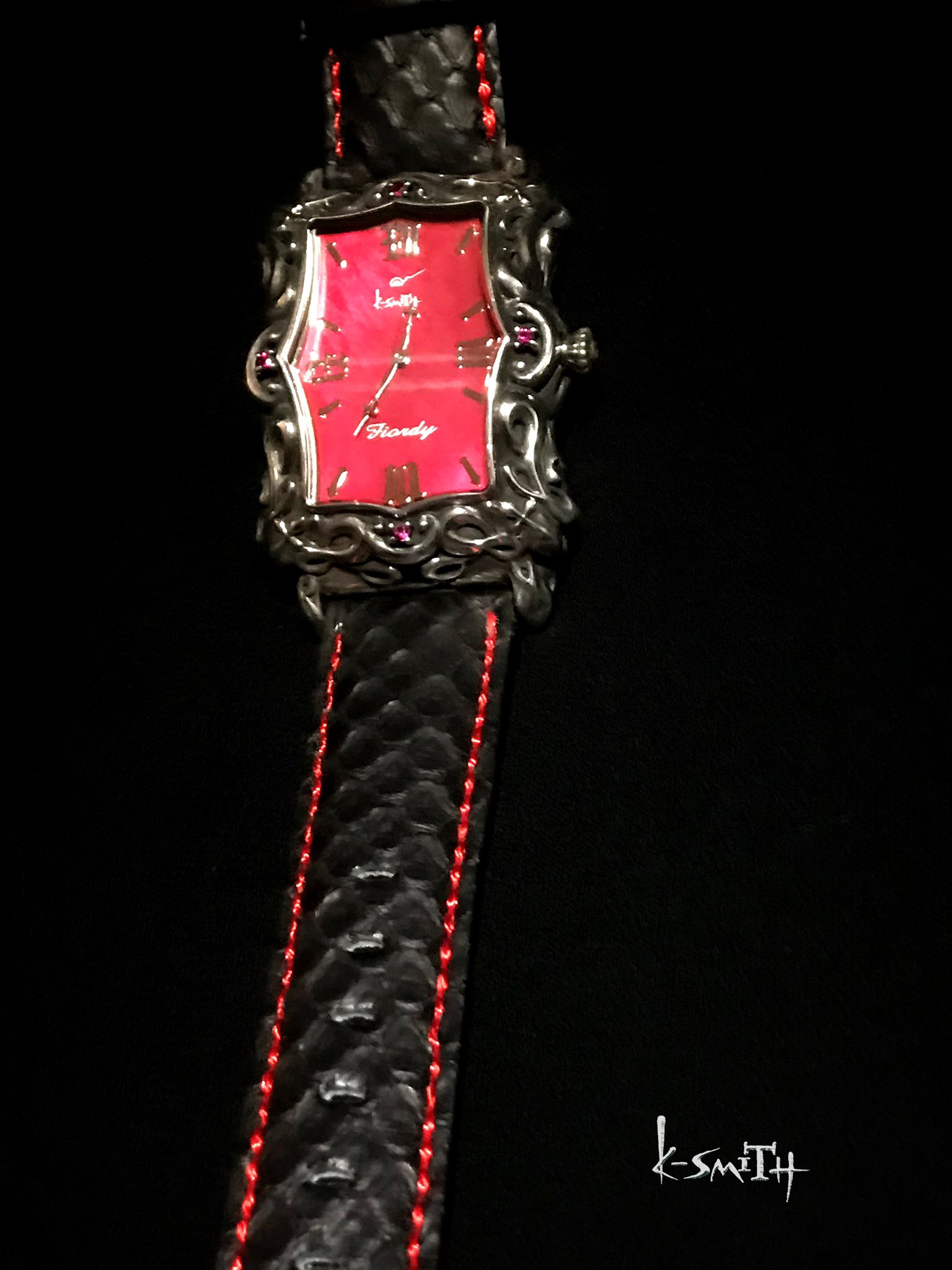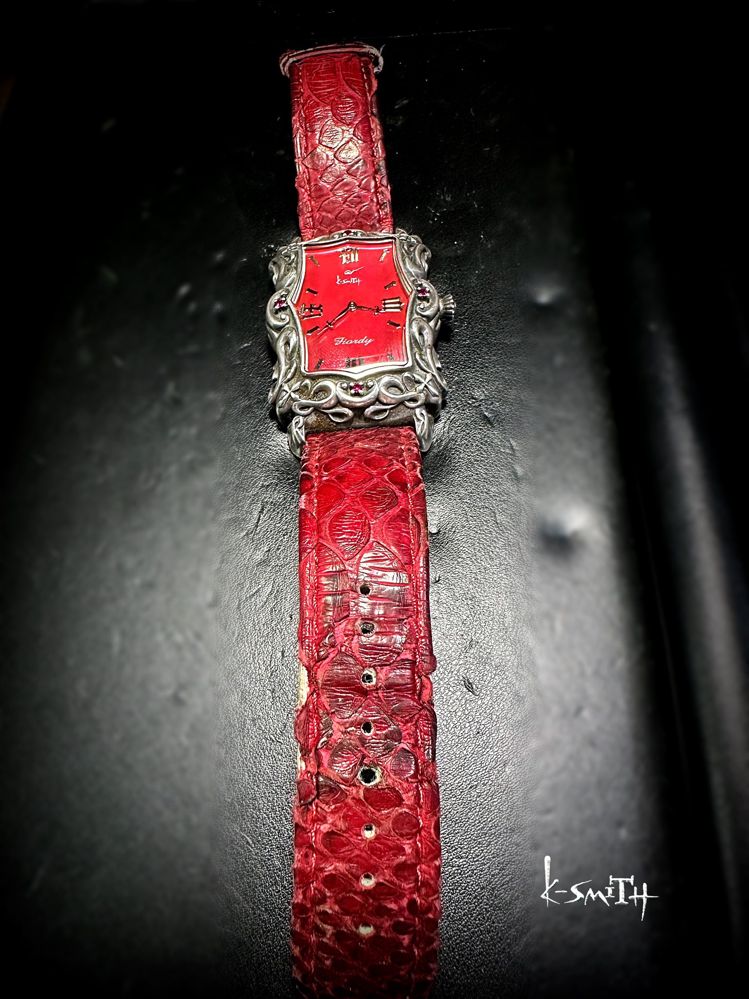お馴染みのシルバー製、K-SMITHオリジナルウォッチ〝アージェントフィオルディ〟の古くなったレッドパイソンをご要望にて新しいフィオルディ用ブラックパイソンに赤いステッチを手縫いにて縫わせていただきました!!